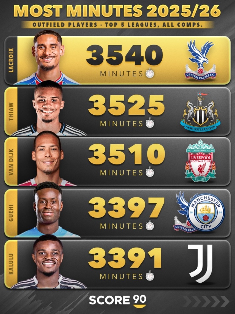 3月3日讯 Score90统计出了本赛季五大联赛迄今为止,各项赛事出战比赛时间最多的30名非门将球员,水晶宫的拉克鲁瓦以3540分钟居首,利物浦队长范戴克以3510分钟位居第三。