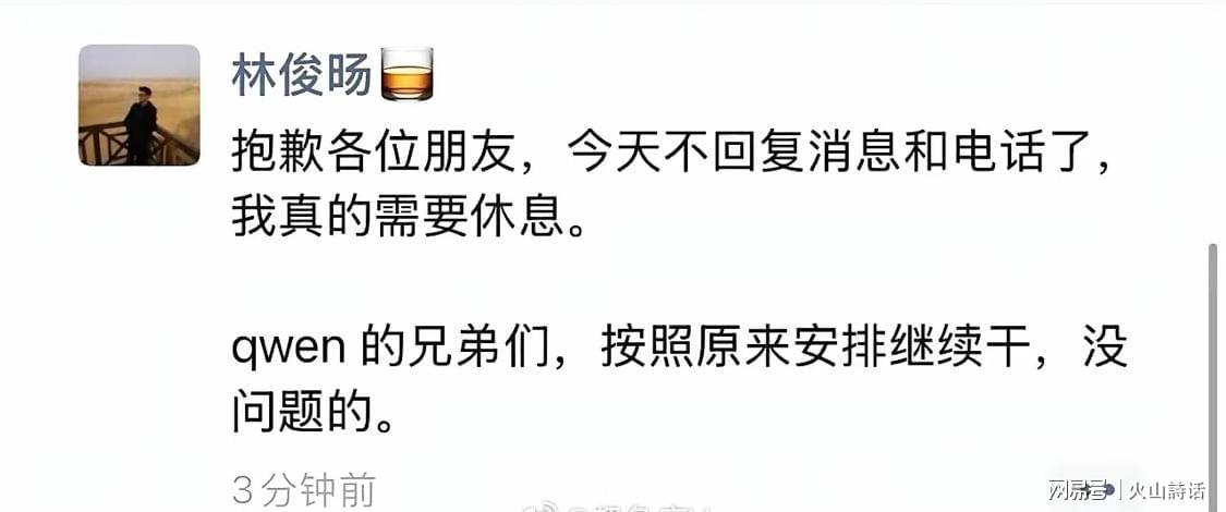 当天下午,林俊旸在朋友圈表示:抱歉各位朋友,今天不回复消息和电话了,我真的需要休息。qwen 的兄弟们,按照原来安排继续干,没问题的。